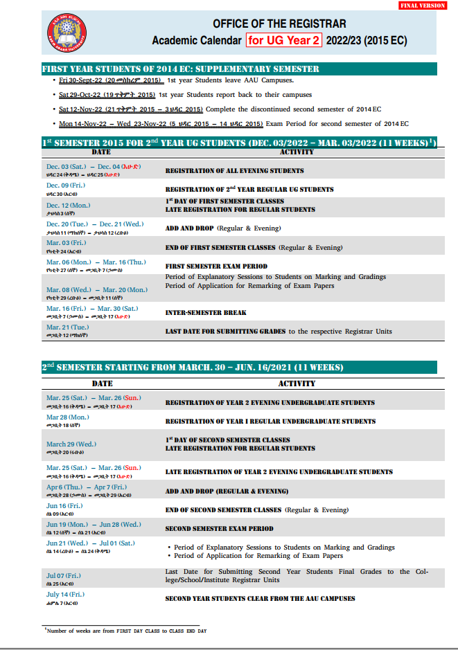 Addis Ababa University Office Final 2022/2023 Acadamic Calander(2010E.C)